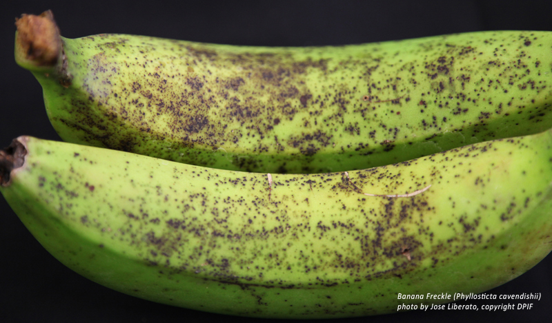 Banana Freckle Disease is caused by a fungus that has two distinct forms (and names): Guignardia musae (telomorph) or Phyllosticta musarum (anamorph). Banana Freckle Disease infects the leaves and fruits of bananas. There are several different strains of the fungus that are able to infect different banana varieties around the globe.
